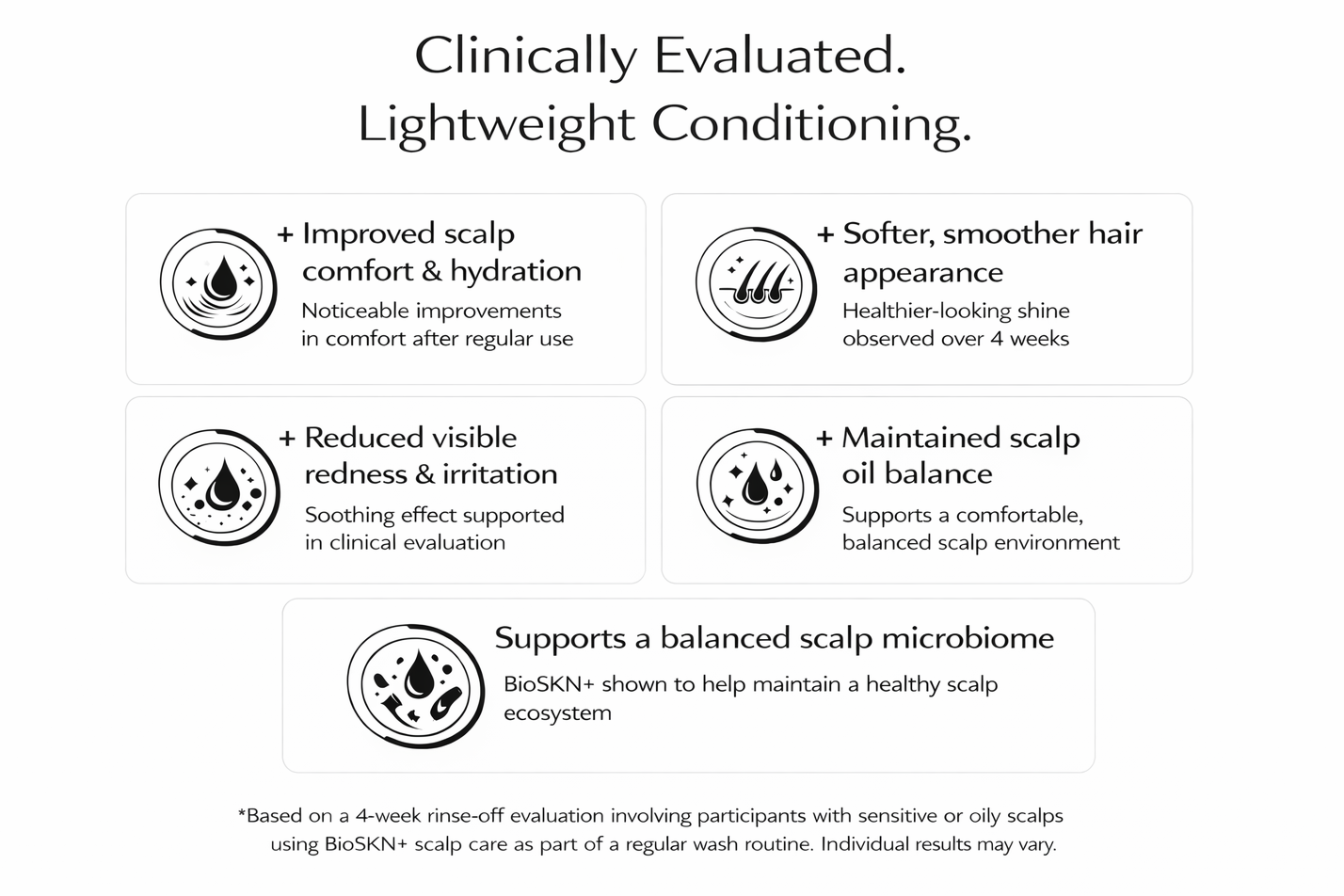 BioSKN+ has been evaluated through independent laboratory testing and dermatological assessments, alongside a 4-week rinse-off clinical study in volunteers with oily and sensitive scalps. When used within a balanced scalp-care routine, BioSKN+ was associated with visible improvements in scalp comfort, oil balance, and overall hair appearance within the first month.